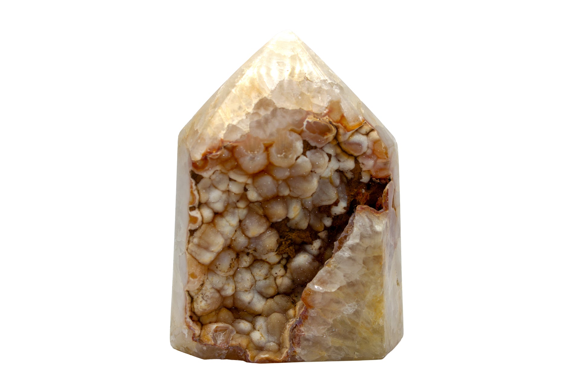 A banded variety of Chalcedony, a Quartz mineral, with pink, brown, and gray layers. This piece is polished into a tower.