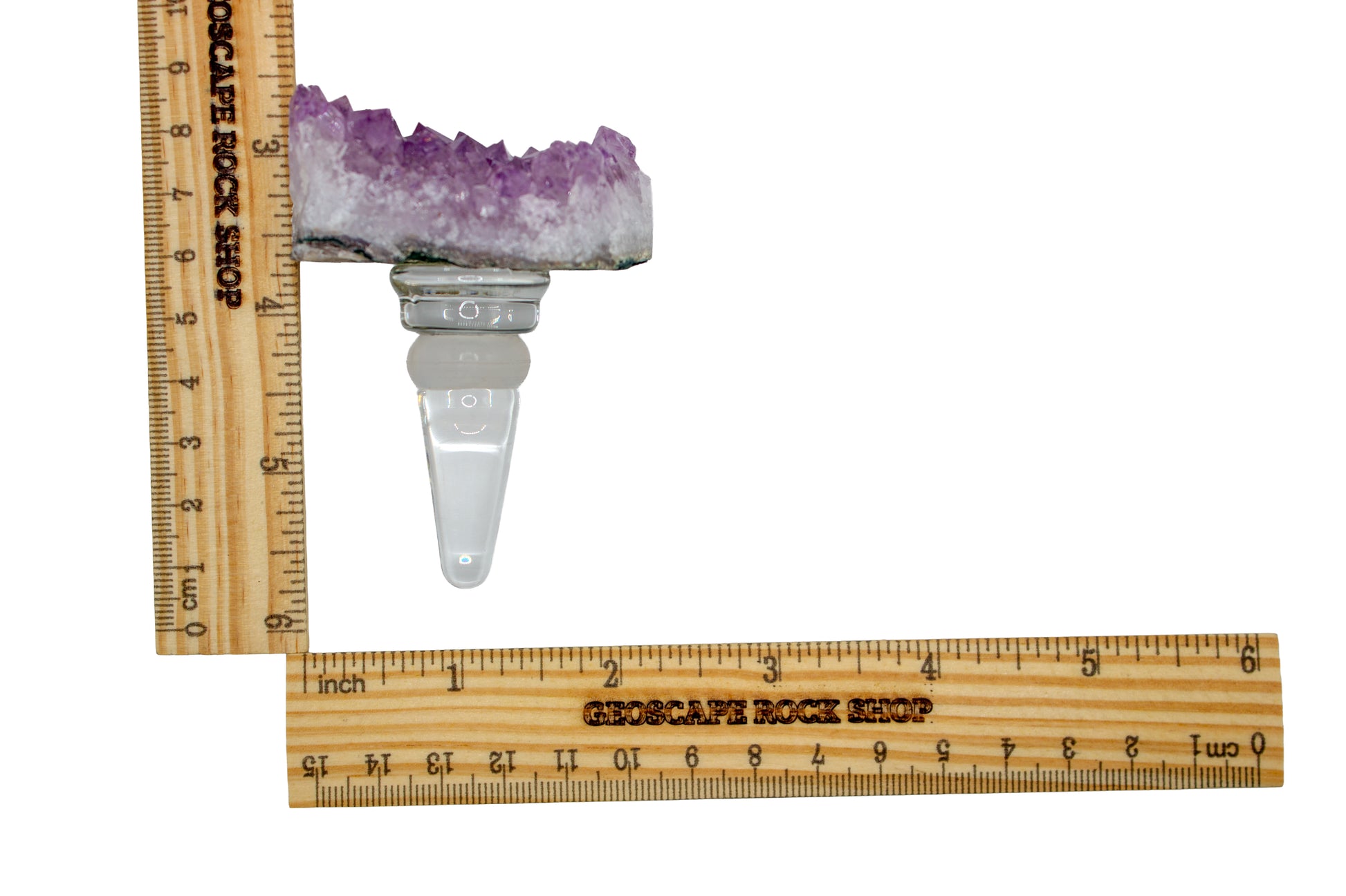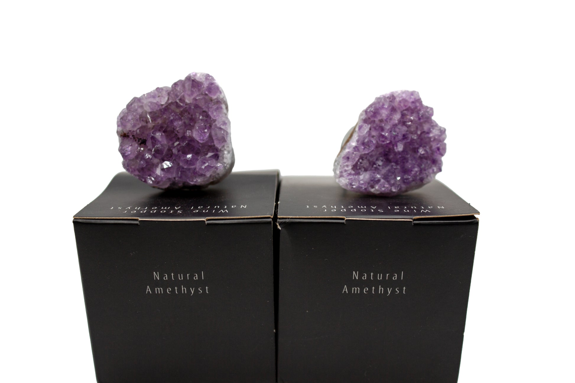 Amethyst is a purple variety of quartz that gets its color from irradiation and inclusions of iron in the crystal lattice. Amethyst has been prized for thousands of years as a gemstone, commonly being used in jewelry. Ancient Greeks believed that amethyst prevented the intoxicating effects of alcohol. Amethyst was considered a precious gem until the 18th century when large deposits were discovered in South America. These pieces are glued to a wine stopper.