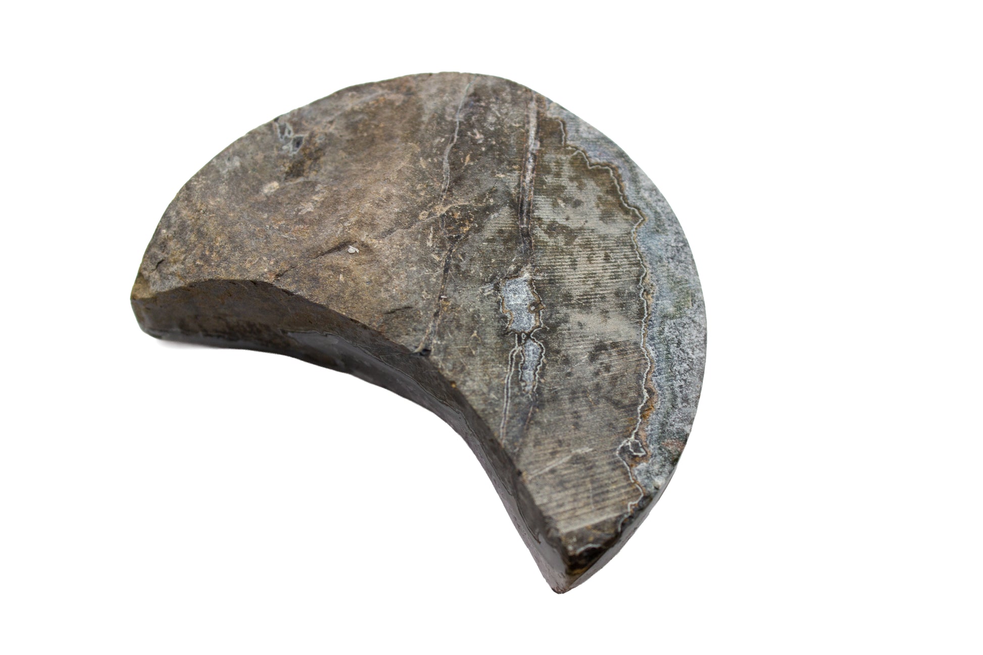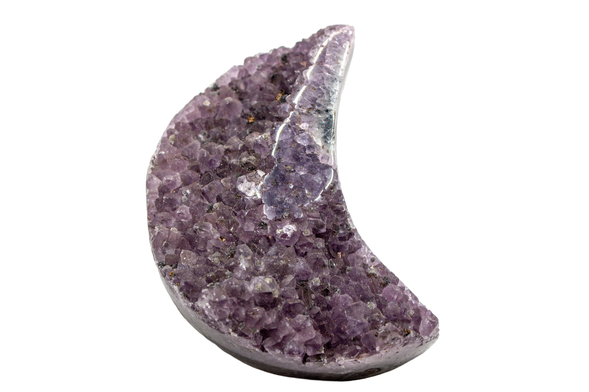 Amethyst is a purple variety of quartz that gets its color from irradiation and inclusions of iron in the crystal lattice. Amethyst has been prized for thousands of years as a gemstone, commonly being used in jewelry. Ancient Greeks believed that amethyst prevented the intoxicating effects of alcohol. Amethyst was considered a precious gem until the 18th century when large deposits were discovered in South America. This piece is polished into a moon shape.