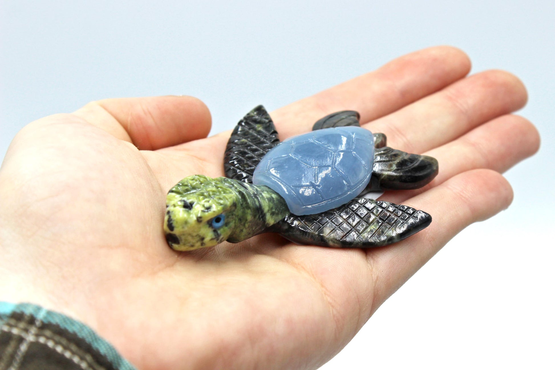 Hand carved and polished serpentine turtle with an angelite shell.