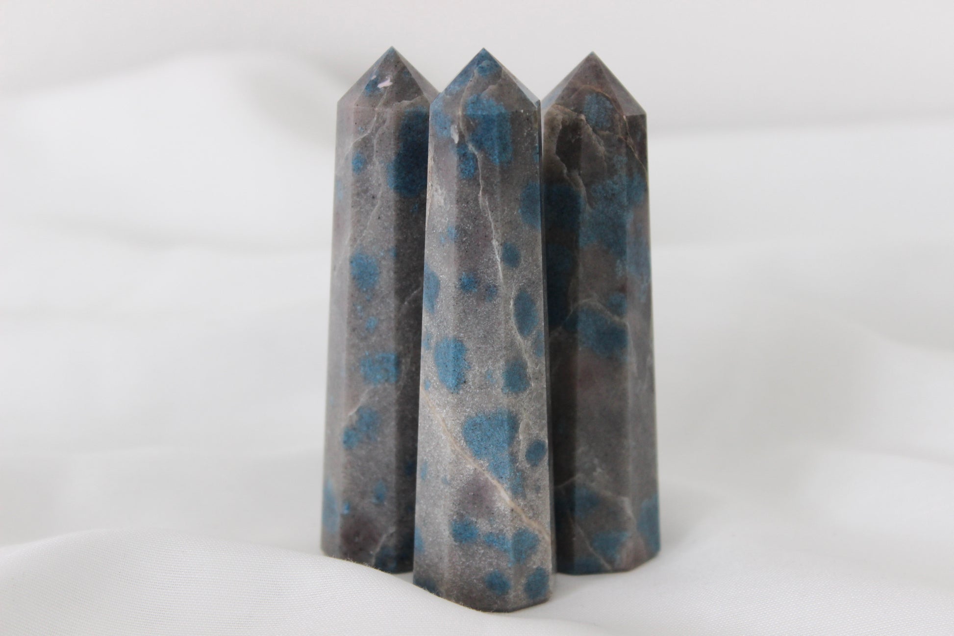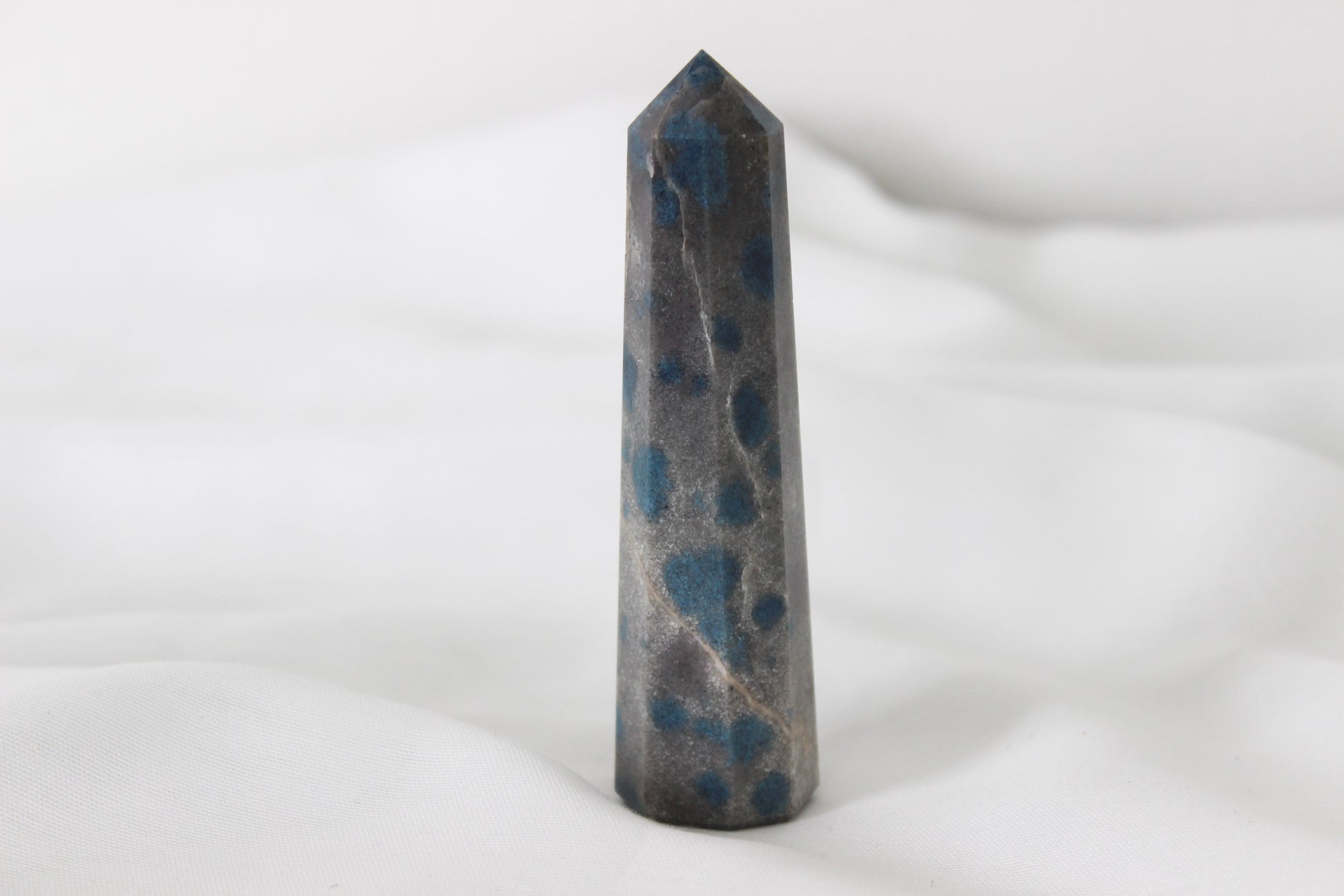 K2, also known as “K2 Granite” and “Raindrop Azurite”, is a unique stone found only in the snowy peaks of the second-highest mountain in the world, K-2. These mountains border China and Pakistan, with the stone itself only found on the Pakistan side to date. This crystal is extremely rare and has a mining process, unlike any other stone. The heavy snow, high altitude, and limited resources in the area make the value of this stone incredibly high. These pieces are polished into the shape of an obelisk.