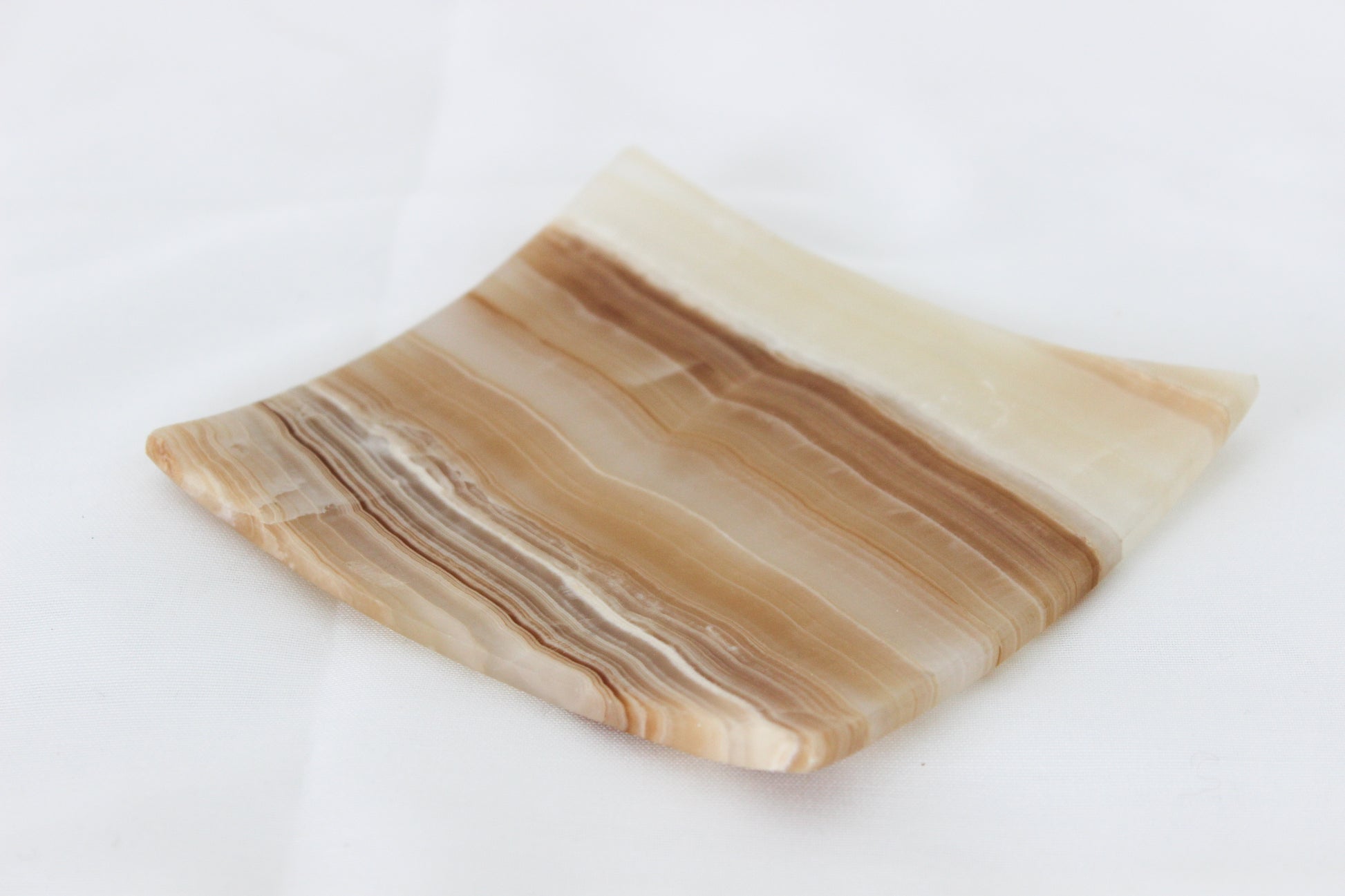 Measuring approximately 4.8 inches in length and height, and .2 inches width. Weighing approximately .4 pounds. Exact measurements, weight, and banding may vary slightly between pieces as each is unique.