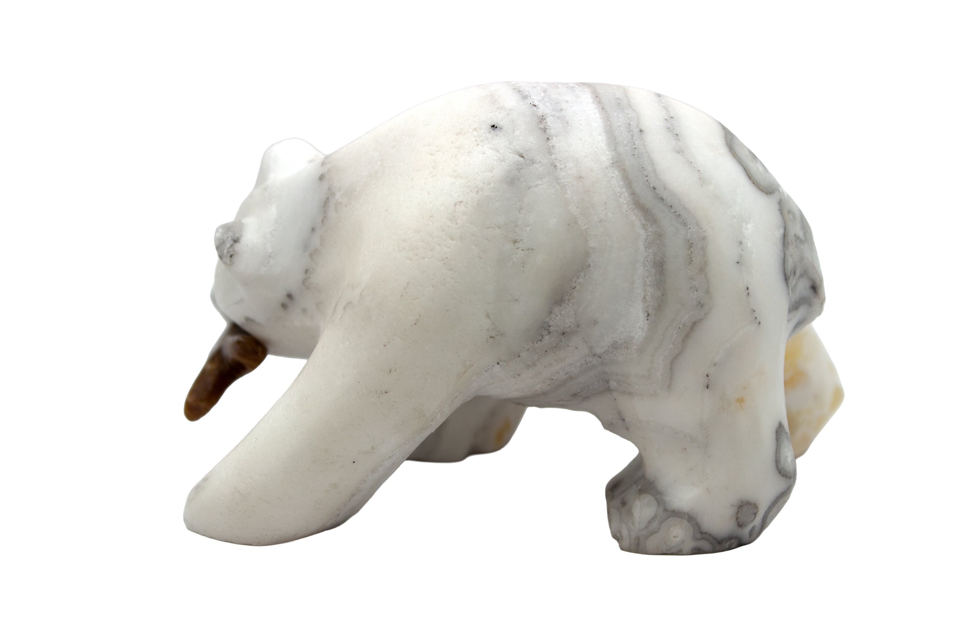 Pakistani onyx, the bands formed by the deposition of calcite saturated with iron. The iron oxidizes into reddish bands while the reduced iron creates green or whitish banding. This piece is polished into a bear shape, with a fish in its mouth.