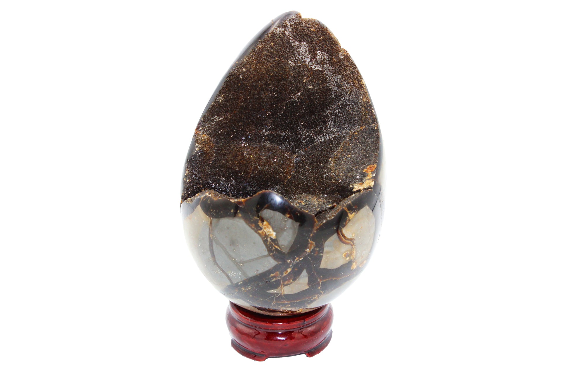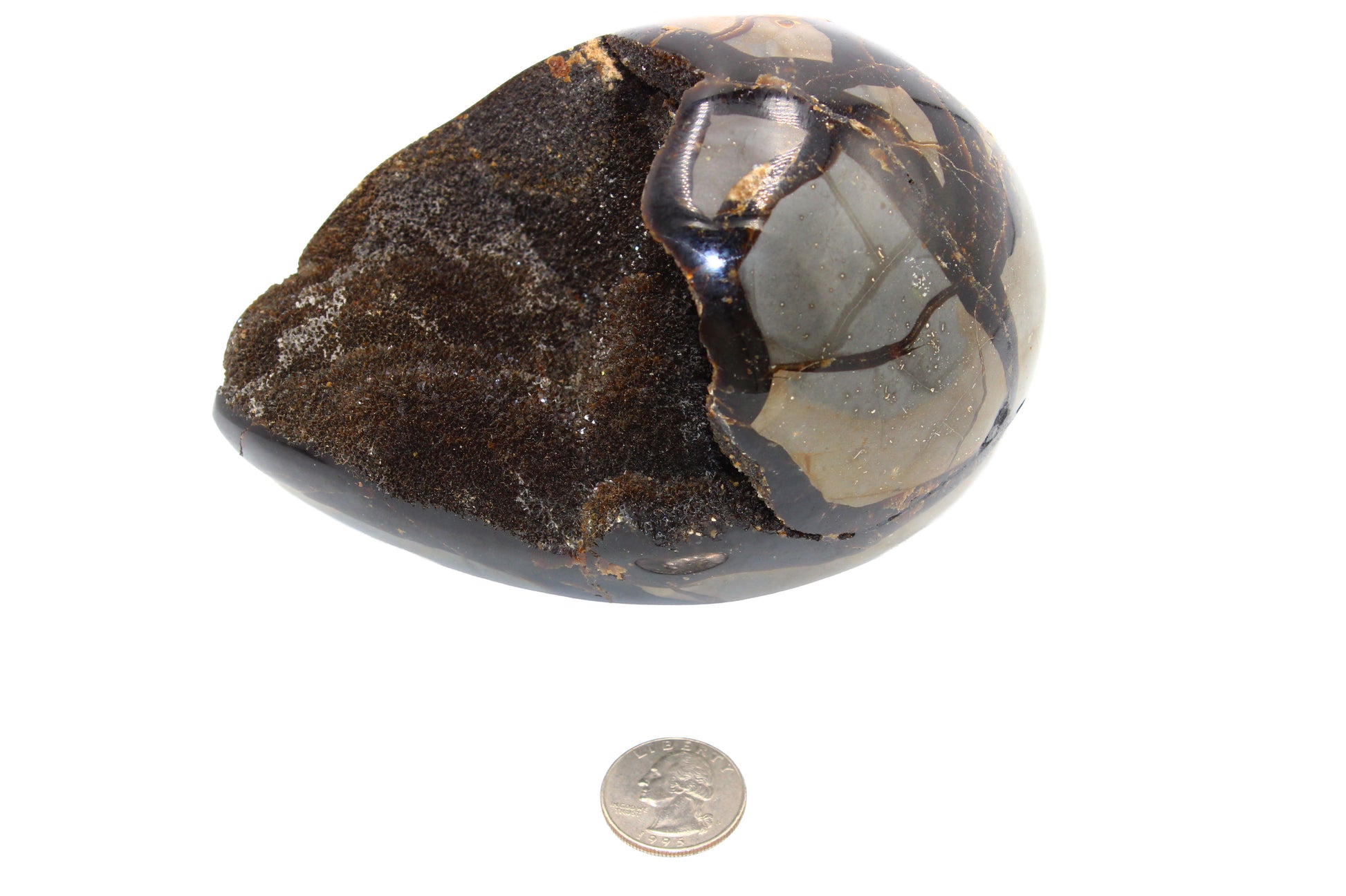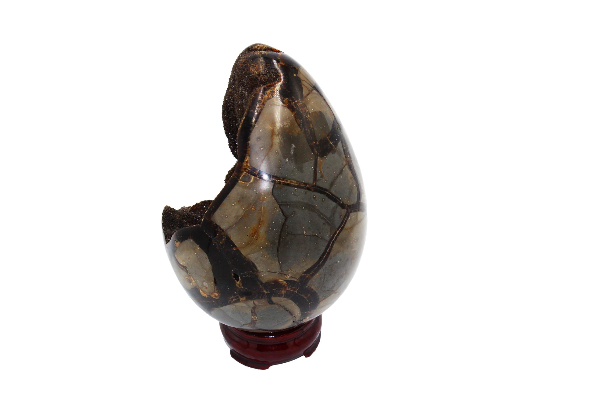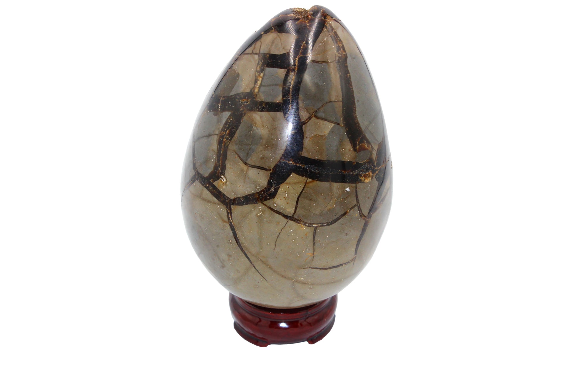 Septarian Dragon Eggs are septarian nodules that have been carved and polished into an palm stone shape. The natural cracked pattern gives a unique dragon-skin look. These nodules start out as a ball of mud, when the mud dries out and cracks, minerals (primarily calcite and aragonite) fill in the cracks.