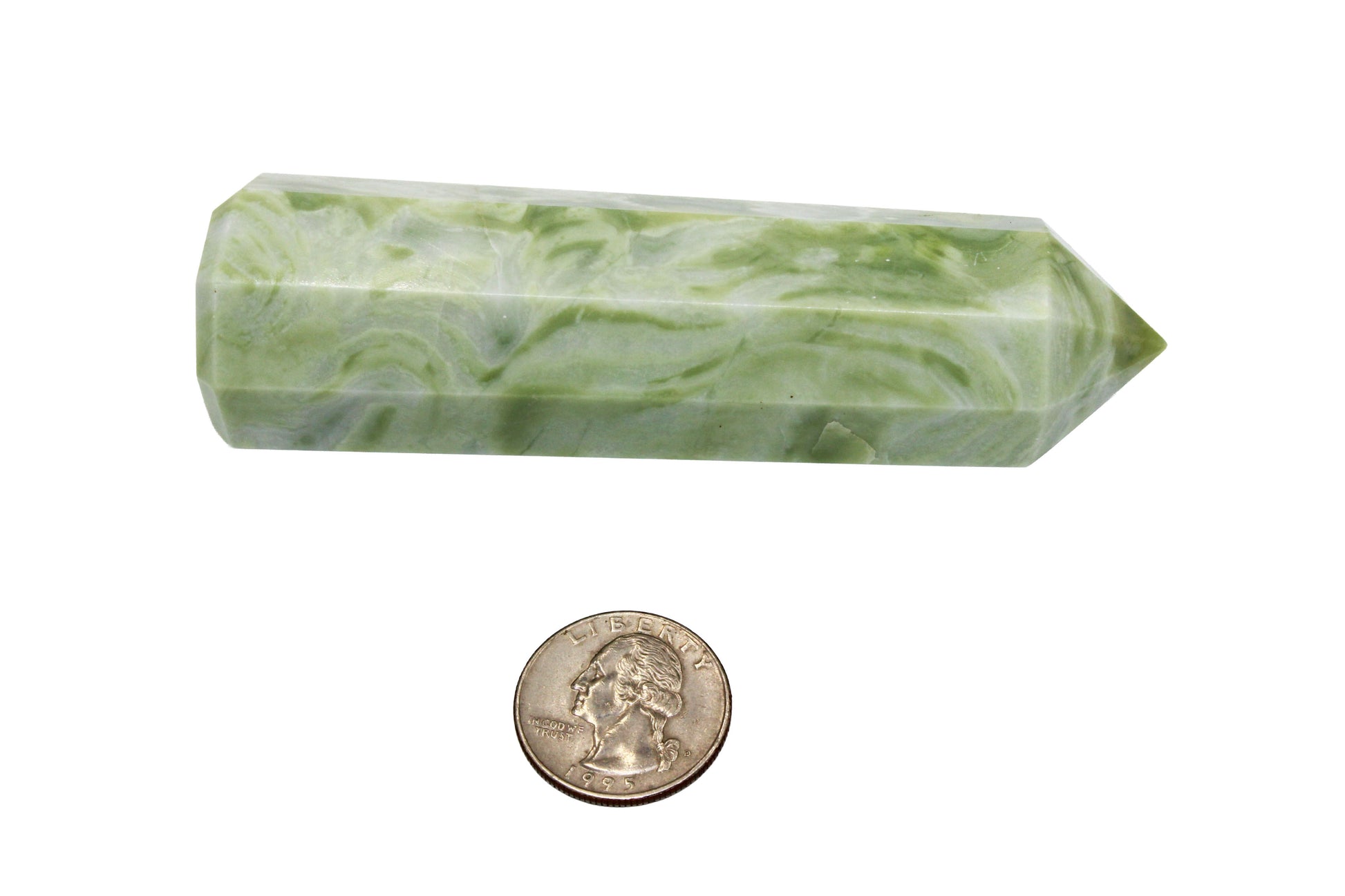 Serpentine has been used as an architectural stone for thousands of years. It is available in a wide variety of green and greenish colors, often has an attractive pattern, works easily, and polishes to a nice luster. These pieces are polished into an obelisk shape.